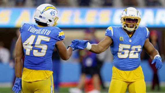 Tuipulotu began his rookie season in a rotational spot behind Mack and Bosa, but injuries thrust him into a larger role than expected. He finished fifth among rookies in pressures (44) and tied for sixth in sacks (4.5). In his second year, he took another step, leading the Chargers in sacks (8.5) and quarterback hits (17). As his play improved, so did his comfort level.