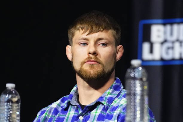 LAS VEGAS, NEVADA – MARCH 07: Bryce Mitchell is seen on stage during the UFC 314 press conference at Michelob ULTRA Arena on March 07, 2025 in Las Vegas, Nevada. (Photo by Jeff Bottari/Zuffa LLC)